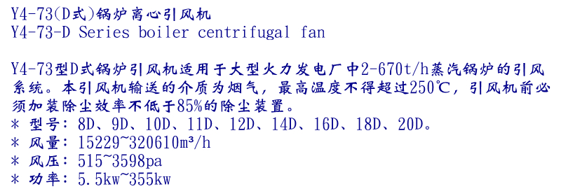 Y4-73型D式鍋爐引風(fēng)機(jī)適用于大型火力發(fā)電廠中2-670t/h蒸汽鍋爐的引風(fēng)系統(tǒng)。本引風(fēng)機(jī)輸送的介質(zhì)為煙氣,最高溫度不得超過250℃,引風(fēng)機(jī)前必須加裝除塵效率不低于85%的除塵裝置。