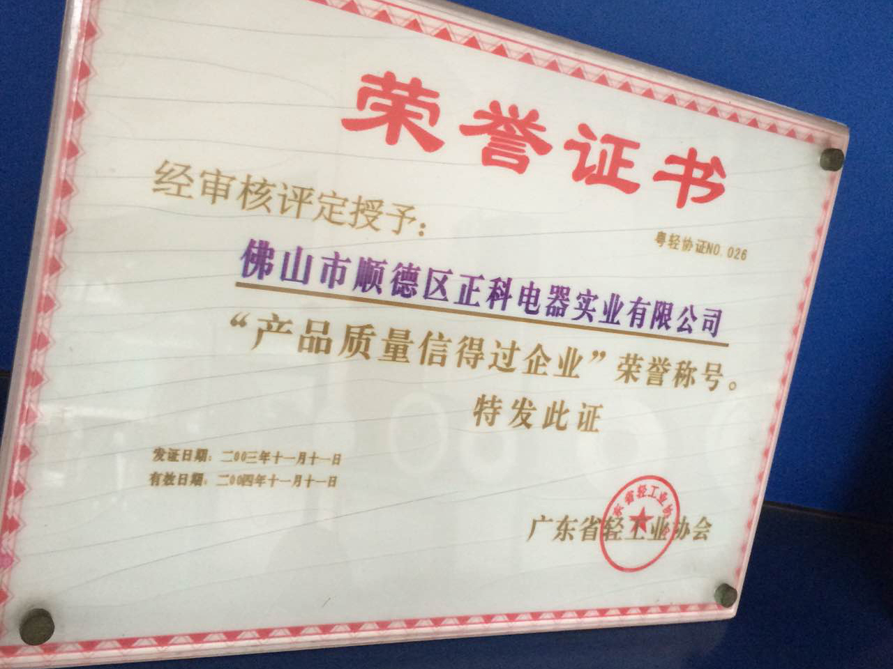 廣東省輕工業(yè)協(xié)會授予風臣風機為產(chǎn)品質(zhì)量信得